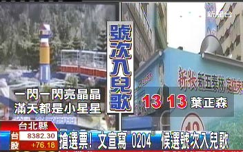 據臺灣TVBS報道,臺灣“五都”選舉進入倒數計時,候選人紛紛出奇招,開著宣傳車穿梭大街小巷,賣力向選民宣傳,有人把候選號碼結合耳熟能詳兒歌。