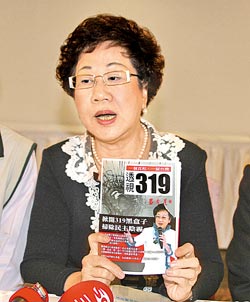 前臺灣地區(qū)副領(lǐng)導(dǎo)人呂秀蓮拿出自己的著作《透視319》,要求臺當(dāng)局查明319、連勝文兩起槍擊案的真相。她表示,有關(guān)319的資料,她早就整理好了,研判以賭盤成分居高。圖片來源:臺灣《中國時報》