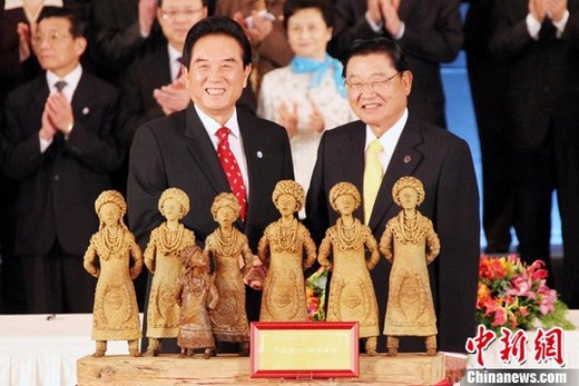 圖為協議簽署后,江丙坤向陳云林贈送的陶土雕塑“齊心傳唱和諧天籟”。該雕塑由著名藝術家張世蓉以臺東特有陶土雕塑,經高溫燒制而成,表現六位身著傳統慶典華服的排灣女子,齊心頌唱著兩岸和平、和諧之天籟美聲。中新社記者 黃少華 攝