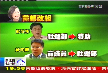 報(bào)道稱,此次人事改組,民進(jìn)黨原政策會(huì)執(zhí)行長(zhǎng)劉建忻升任民進(jìn)黨第3副秘書(shū)長(zhǎng);原青年部主任黃重諺接手政策會(huì);而原社運(yùn)部主任郭文彬,將轉(zhuǎn)任特助,遺缺延攬卸任議員黃向群。此次改組名單比較敏感的是黃向群,他過(guò)去親蘇色彩鮮明,如果蔡英文真的投入2012“大選”初選,將極可能和蘇貞昌形成競(jìng)爭(zhēng)關(guān)系,兩大陣營(yíng)現(xiàn)在已經(jīng)開(kāi)始搶人挖角,蘇蔡2012出線大戰(zhàn)浮上臺(tái)面,正式拉開(kāi)序幕。