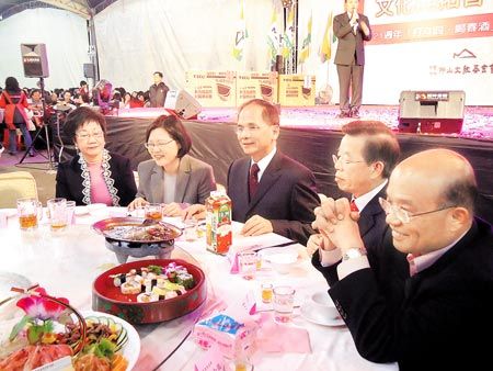 民進黨主席蔡英文(左二)、前臺灣地區副領導人呂秀蓮(左一)及前陳水扁當局“行政院長”蘇貞昌(右起)、謝長廷、游錫堃,7日在宜蘭運動公園聚首,一同喝春酒。 來源:臺灣《中國時報》