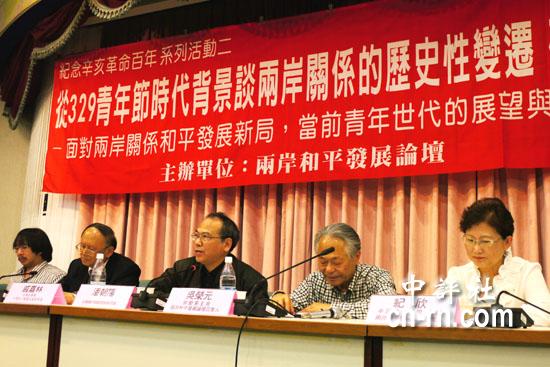 據中評社報道,兩岸和平發展論壇紀念辛亥革命百年活動的第二場活動,以“從329青年節時代背景談兩岸關系的歷史性變遷”為主題,討論“面對兩岸關系和平發展新局,當前青年世代的展望與出路”研討會昨天舉行,中國統一聯盟主席紀欣期盼有更多的青年人,能響應孫中山先生所呼吁的“兩岸統一、振興中華”偉業。
