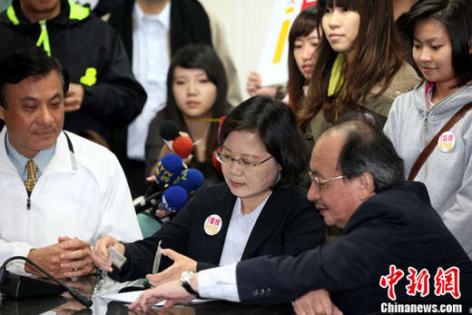 3月23日,民進黨主席蔡英文(中)來到臺北民進黨中央黨部,領表登記參加2012臺灣當局領導人選舉民進黨黨內初選。中新社發 董會峰 攝