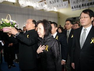 臺中市夜店火災(zāi)死者聯(lián)合公祭,胡志強夫婦率隊致意。圖片來源:臺灣“中廣新聞”