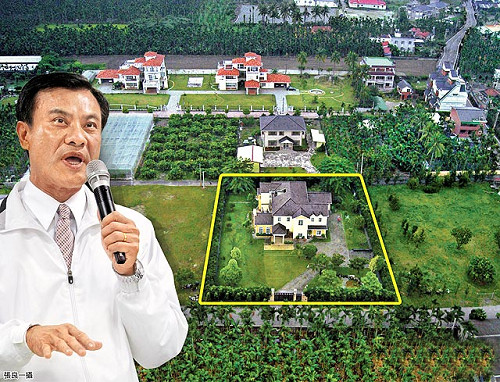 蘇嘉全在屏東縣長治鄉的豪華農舍引發爭議,他昨宣布將建物、土地(黃框處)捐給長治鄉公所做農業公益使用。(圖片來源:臺灣媒體)