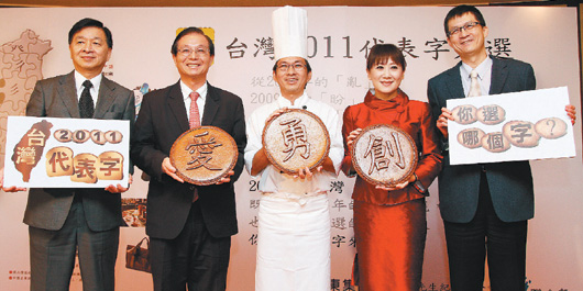 臺灣教育部門負責人吳清基(左二)、面點師吳寶春(中)及SOGO百貨董事長黃晴雯(右二)昨天在“臺灣2011代表字大選”公布候選字記者會中,手持印有“愛、勇、創”的烘焙面包,與徐元智先生紀念基金會執行長黃茂德(左)、《聯合報》總編輯羅國。ㄓ遥榛顒釉靹。(圖片來源:臺灣《聯合報》)