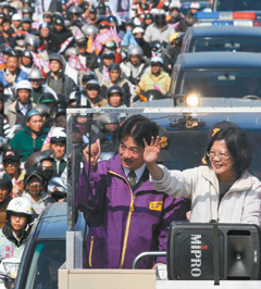 民進黨臺灣地區領導人候選人蔡英文(車上右)在臺南市長賴清德(車上左)陪同下,昨天在臺南市掃街。圖片來源:臺灣《聯合報》