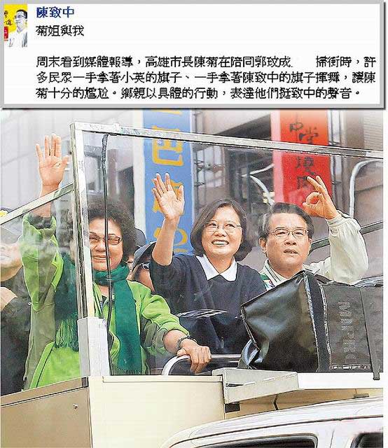 陳致中在文中指出,2006年,他在美國留學時,太太黃睿靚懷孕,陳水扁叫他回來幫陳菊助選,還說:(民進黨)新潮流派系看陳菊的選情不好,已將人力財力都撤出陳菊總部了。他和黃睿靚冒險回臺為她(陳菊)站臺,陳水扁還出錢出力在選前辦“牽手護愛河”活動,陳菊這才驚險當選。