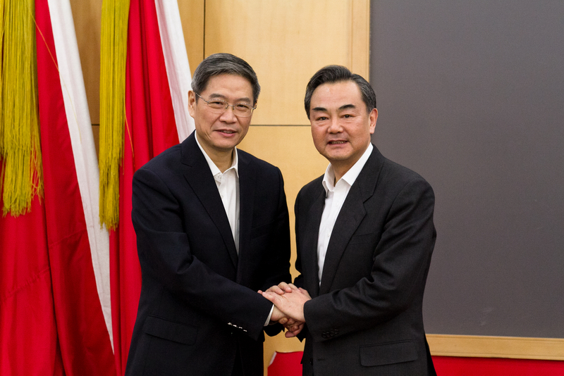 張志軍、王毅親切握手