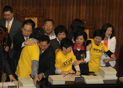 藍(lán)綠民代爭搶主席臺(tái)。(圖片來自臺(tái)媒)