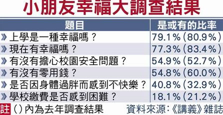 調查結果顯示,約77%受訪學童覺得幸福,比率是繼2004年的74%及2003年的76%之后,調查進行十年來的第三低。臺灣小學生覺得幸福的主因是“溫暖的家、與父母同樂”,不幸福的原因則是課業問題。