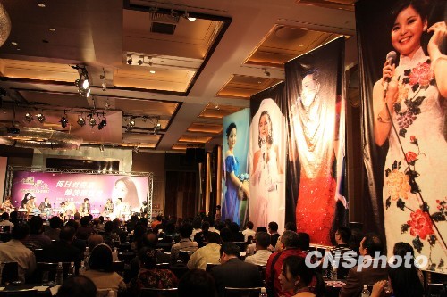 5月7日,一代巨星鄧麗君逝世15周年前夕,海峽兩岸、香港、日本等藝文界知名人士聚首臺北,以連辦4場紀念研討會方式憶談、緬懷鄧麗君。圖為臺北君悅大飯店現場,一側懸掛鄧麗君的大幅照片,伊人音容宛在、楚楚動人。 中新社發 董會峰 攝
