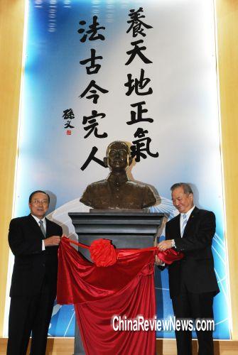 “考試院”6日舉行孫中山銅像揭幕典禮,“考試院長”關中(左)與副院長伍錦霖(右)一起為這座“辛亥百年第一尊”的孫中山銅像揭幕。