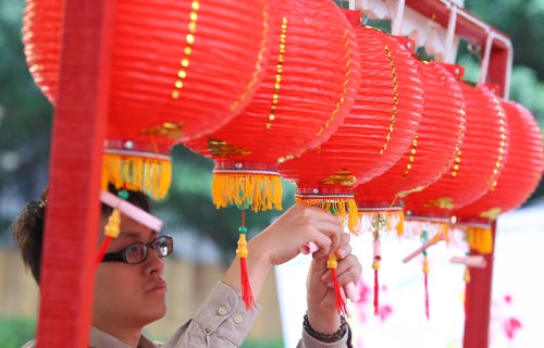 元宵節(jié)將至,臺北花博新生園區(qū)的花夢廣場10日舉行猜燈謎活動,答對的人可獲得花博小禮物。一名工作人員將謎題綁在燈籠上。圖片來源:臺灣“中央社”