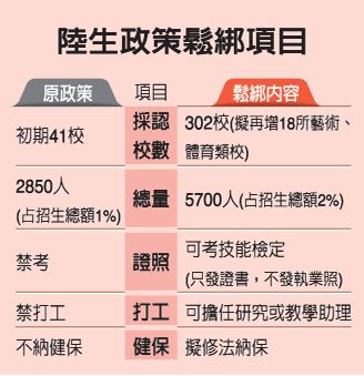 臺當局松綁針對陸生的“三限六不”政策項目。(圖片來自臺媒)