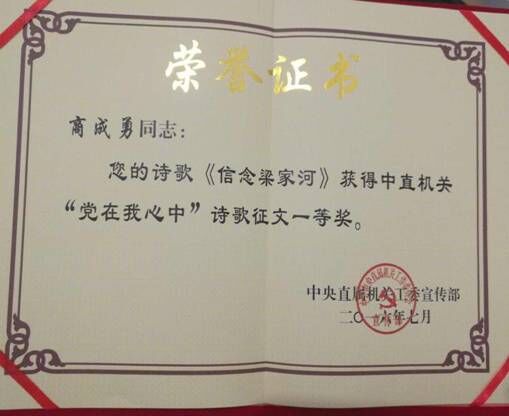 由商成勇創(chuàng)作的《信念梁家河》日前獲得中直機(jī)關(guān)“黨在我心中”詩歌征文一等獎。在收到獲獎證書后,他激動地說:“這個分量很重的證書,說明謳歌時代、謳歌黨、謳歌我們黨的干部在艱難困苦環(huán)境中堅定信念,帶領(lǐng)群眾努力脫貧的奮斗精神受到肯定。同時,主旋律與正能量作品永遠(yuǎn)有市場和受眾。”
