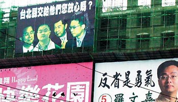 國民黨日前在板橋市豎起選舉廣告牌,上面有陳水扁、羅文嘉、陳哲男、馬永成的照片,只有一句話“臺北縣交給他們您放心嗎?”。右下方是羅文嘉的“反省是勇氣”廣告牌,究竟誰當縣長能帶給臺北縣民快樂?將由選票來決定。(臺灣聯合報圖)