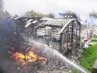 苗栗縣后龍鎮地下爆竹工廠爆炸,以鋼架及鐵皮搭建的廠房被夷為平地,消防人員以水柱撲滅余火!堵摵蠄蟆酚浾吡_緗綸攝