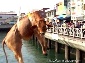 大黃牛拼命仰著頭不讓海水淹過口鼻,在水里載浮載沉,狼狽的任由脖子上的繩索拉著走。好不容易靠近岸邊,幾個(gè)人接力試圖將大黃牛拉上石階,但或許是因?yàn)槠咦彀松嗟挠懻撀暫蛧^民眾關(guān)愛的眼神,讓大黃牛嚇到動都不敢動,最后只能請助消防隊(duì)出動吊車。