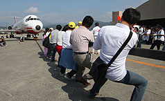 據(jù)“中央社”報(bào)道,遠(yuǎn)航宣布舉辦拉飛機(jī)活動(dòng)后,13天共吸引3000人次上網(wǎng)預(yù)測(cè)。拉飛機(jī)活動(dòng)上午登場(chǎng),分成民眾組與網(wǎng)絡(luò)預(yù)測(cè)關(guān)注的遠(yuǎn)航員工組等兩場(chǎng),平常需要40輛車才拖得動(dòng)的飛機(jī)重量,拔河選手從15人開始試?yán)鸫渭尤?人,選手分成兩列,從機(jī)鼻左右兩側(cè),用力將機(jī)身向前拔行。