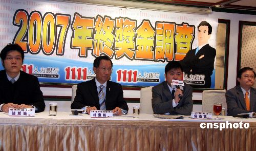 一月二十八日,臺(tái)灣1111人力銀行在臺(tái)北發(fā)布其最新完成的二○○七年終獎(jiǎng)金大調(diào)查,結(jié)果顯示:與上一年度僅一成三受訪者沒有年終可領(lǐng)相比,二○○七年有超過三成上班族確定領(lǐng)不到任何年終,增長一百五十三個(gè)百分點(diǎn)。一成五企業(yè)不發(fā)放二○○七年終獎(jiǎng),不賺錢、景氣差是主要原因。 中新社發(fā) 孫自法 攝