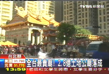 中新網(wǎng)1月19日電 據(jù)臺(tái)灣TVBS報(bào)道,臺(tái)北縣的深丘福德宮,因?yàn)樯w在黃金地段的新板特區(qū),以2年前一平米200萬(wàn)(新臺(tái)幣 下同)的地價(jià)計(jì)算,這間土地公廟地價(jià)已經(jīng)高達(dá)2.8億,號(hào)稱是全臺(tái)最貴的廟。之前因?yàn)椴少?gòu)法遲遲無(wú)法完工,最近終于蓋好了,上午舉行安座大典,神明搬新家,場(chǎng)面相當(dāng)熱鬧。