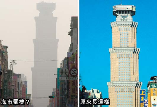 左為,沙塵暴侵襲高雄市,從熱河街看高雄長谷世貿大樓(50層)一片灰蒙,仿佛是在沙漠中看到的海市蜃樓。右為沒有沙塵暴時,在熱河街可以清楚看見長谷世貿大樓。圖片來源:臺灣《聯合晚報》
