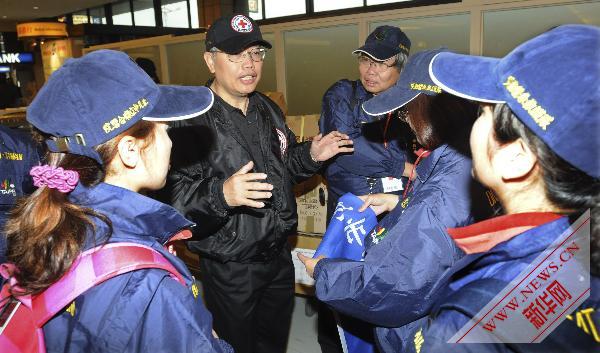 4月18日,在臺(tái)北桃園機(jī)場(chǎng),臺(tái)灣紅十字組織秘書(shū)長(zhǎng)陳士魁(左二)向醫(yī)療隊(duì)員做任務(wù)提示。新華社記者 李寒芳 攝