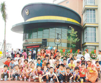 臺南縣新化警分局新建辦公廳舍昨天落成,戴警帽造型獨一無二,幼兒園小朋友參觀覺得新奇有趣。圖片來源:臺灣《聯合報》