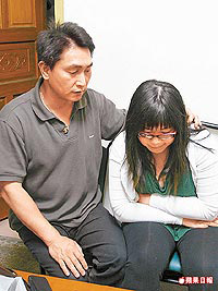 女店員(右)昨在新竹縣議員陳栢維陪同下,控訴被警員當重刑犯上手銬腳鐐。圖片來源:臺灣《蘋果日報》