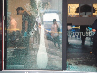 槍擊現場玻璃門上可清楚看到遺留的彈孔。(圖片來源:臺灣《聯合報》)