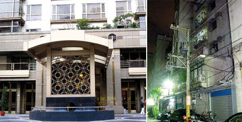 “富家男”溫建和住在臺北市的百達富麗豪宅(左圖),自稱身價數億元,他的會計女友梁玉姍月薪四萬元,住在臺北縣三重市一棟舊公寓(右圖),卻侵占公款供他花用。 圖片來源:臺灣《聯合報》