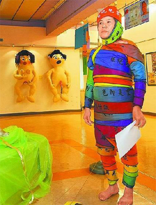 阮仁珠日前在高雄市社會局婦女館的“高雄人體史畫展”展出人體全裸寫生后一再惹議。昨日的表演,原本阮仁珠、呂健志都會全裸,呂健志拆解時會開放民眾朗誦布條上大陸學者方剛的詩作《拒絕包裹》,再由呂健志從阮仁珠的身體里拉出一條紅線。但昨日僅他們2人演出,無民眾參與,呂健志則以彩色絲布掩蓋下體。
