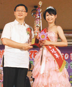 桃園縣長吳志揚(左)頒發冠軍獎座給第二屆桃園蓮花公主第一名張以欣(右)。圖片來源:聯合報