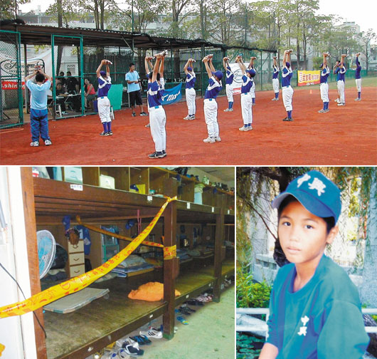 南投縣中興初中青少棒隊員蔡祥龍(右下圖),前天深夜在寢室(左下圖)跪坐在下鋪床板,以紅色尼龍布繩繞頸身亡。上圖為中興棒球隊之前練習的情形。(圖:臺灣《聯合報》)