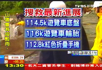 上午11時52分,救援人員在蘇花公路114.5公里處發(fā)現(xiàn)了一個大型游覽車底盤,但目前尚無法判定是否就是失聯(lián)的創(chuàng)意旅行社游覽車,預計要將底盤空運到宜蘭縣運動公園做進一步調(diào)查。