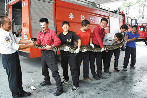 屏東縣消防局東港分隊在東港溪畔捕獲的巨蟒逾4米長、重40公斤,須8名隊員才能抬起。 圖片來源:臺灣《聯(lián)合報》