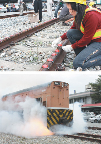 花蓮運(yùn)務(wù)段昨天銷毀全臺(tái)最后一批響燉,員工將468個(gè)預(yù)備報(bào)廢的響燉,一個(gè)個(gè)裝在鐵軌上(上圖),當(dāng)列車壓過響燉時(shí),產(chǎn)生巨大聲響與濃煙(下圖)。圖片來源:臺(tái)灣《聯(lián)合報(bào)》