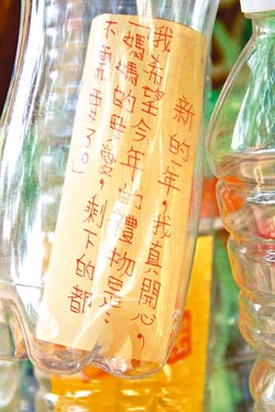 渴求親情▲云林縣古坑鄉(xiāng)偏遠小學華南小學的飲料瓶心愿樹,讓全校70個小孩放上自己的愿望,其中有個小女孩寫下“希望今年禮物是媽媽的母愛,剩下的都不需要了”,令人鼻酸。圖片來源:臺灣《中國時報》