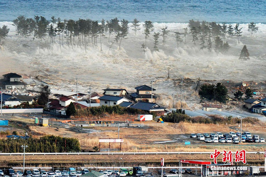 3月11日,日本東北部名取,海嘯掀起的大浪沖向陸地。