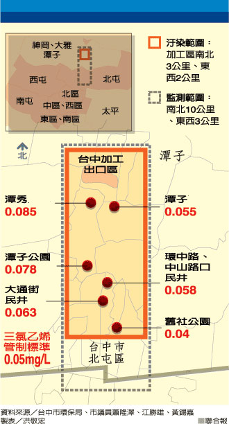 但臺中市環(huán)保局前年底接獲潭子“臺中新城”小區(qū)民眾陳情,指小區(qū)管理委員會定期送驗簡易自來水(即抽取地下水再處理),竟驗出有三氯乙烯,大家驚恐萬分,要求環(huán)保局重視。