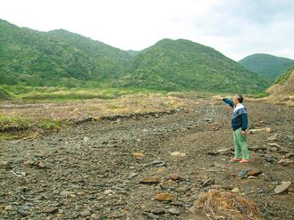 臺東縣達仁鄉南田村民張見賢伸手往前一指,表示前方就是臺電核廢料處置場的預定地。圖片來源:臺灣《聯合報》