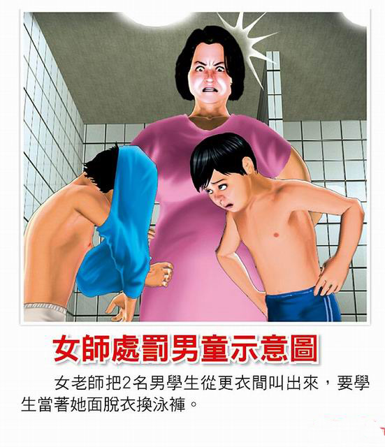 校方調(diào)查,上周二上完游泳課后,2名男學(xué)生在更衣間內(nèi)大聲吵鬧,女體育教師把2名男學(xué)生叫出來斥責(zé),并要2人在其面前脫光換衣服,甚至還要男學(xué)生用手遮住“重點(diǎn)部位”,還說“沒遮好就是暴露狂”,讓男學(xué)生身心受創(chuàng)。家長批評,女老師嚴(yán)重缺乏教育專業(yè),踐踏學(xué)生自尊心,“雖然小學(xué)生發(fā)育尚未完全,但身體權(quán)也不容侵犯。”