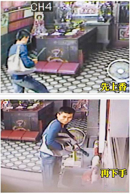林煒強先點香拜拜求心安(上圖);破壞賽錢箱時,賊頭賊腦觀察周邊動靜(下圖)。圖片來自網絡