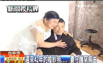 據臺灣TVBS電視臺報道,臺中一位黃太太在結婚42年后,總算如愿披上白紗,她16歲那年,不顧家人反對嫁給先生,沒公開宴客,也沒拍婚紗,8年前,先生罹患小腦萎縮癥,病情逐漸惡化,于是,3位兒女決定在母親節前夕,安排爸爸套上西裝、媽媽披上白紗,彌補當年沒能拍婚紗照的遺憾。兩人堅貞愛情令人動容。