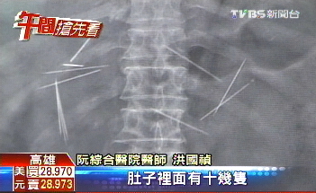 據報道,高雄市1名80歲的婦人感到腹部疼痛并且高燒不退緊急就醫,醫師檢查后,發現老婦人胃部和十二指腸里有多處穿孔,其中1根針更是垂直穿破十二指腸,到達婦人的背部肌肉層,造成其靜脈血管血栓,醫師最后以開刀方式取出其中15根針,但垂直插入的針因不容易取出,只能放棄。