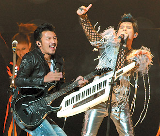 周杰倫(右)高雄演唱會,昨一開場便與謝霆鋒互飆樂器,臺下歌迷尖叫。(圖片來源:臺灣《聯(lián)合報》)