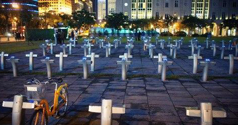臺北市政府在捷運站附近提供公用自行車租用服務,目前共有50余個租用站,照片上的地點位于忠孝東路五段與松仁路口。租用站在綠地上鋪上石板,照片中有幾十根停車柱整齊排列,腳踏車因為都被租出,因此在燈光下看來就像“墓地”,還被惡搞成反核示意圖。