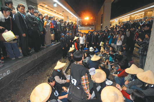 據(jù)臺(tái)灣《聯(lián)合報(bào)》報(bào)道,昨晚7時(shí)40分,近200名勞工“攻占”臺(tái)北火車站第3月臺(tái)后,數(shù)十位年長(zhǎng)勞工于8時(shí)許火車進(jìn)站時(shí)集體跳下月臺(tái)臥軌。晚間近9時(shí),臺(tái)北鐵路警察驅(qū)離軌道上的抗議者,列車逐漸恢復(fù)通行。不過(guò),臺(tái)北站第3月臺(tái)上的抗議者直到晚間10時(shí)58分才被清場(chǎng)。據(jù)臺(tái)鐵估計(jì),昨晚因勞工抗議活動(dòng),共有40列次火車晚點(diǎn),延誤超過(guò)10600名旅客。