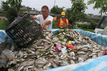 今天上午9時45分,民眾發現,五結鄉五股排水五十二甲橋下游浮現大量吳郭魚、烏仔魚等淡水魚類,死魚綿延長達2公里且有惡臭。環保局派員打撈清除,環保局綜合科長郭峰志說,估計死魚上萬尾,宜蘭縣動植物防疫所已采集魚體化驗,厘清是否毒物污染造成。